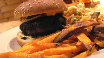 Jos kaikki meni putkeen, niin bataattien ollessa kypsiä kaikki muutkin ovat valmiita. Kasaa hampurilainen; pohja, majoneesi, herkkusienet, pihvi, juusto, kansi. Tarjoile lisäksi autenttisuuden turvataksesi cole slaw:ta, eli salaattia jossa on pääosassa valkokaali ja porkkana. Googleta, jos kiinnostaa.